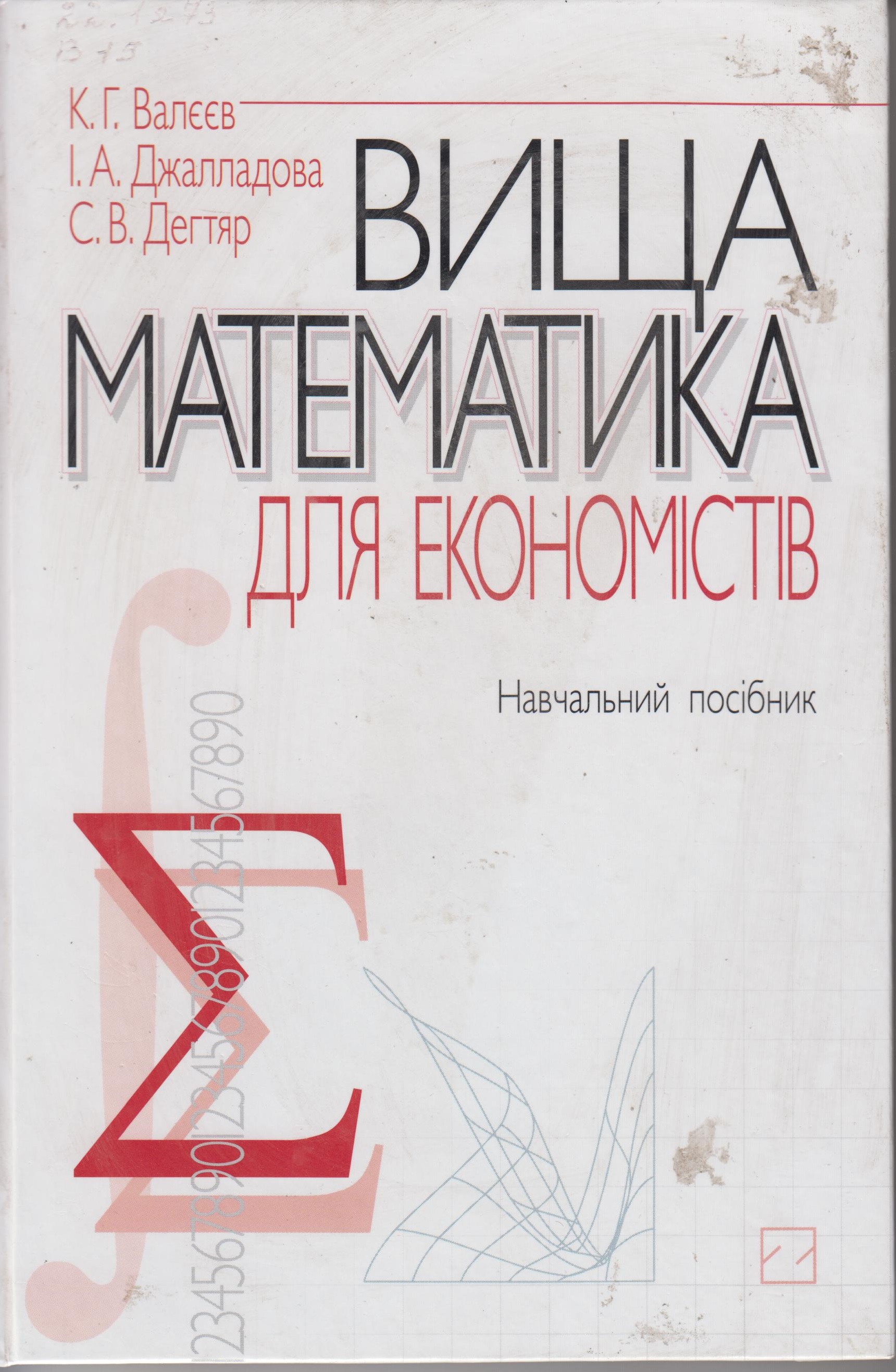 Валєєв Кім Галямович. Вища математика для економістів : навчальний посібник / К. Г. Валєєв, І. А. Джалладова, С. В. Дегтяр. - Киiв : Знання, 2011. - 287 с. ISBN 978-966-346-646-0
