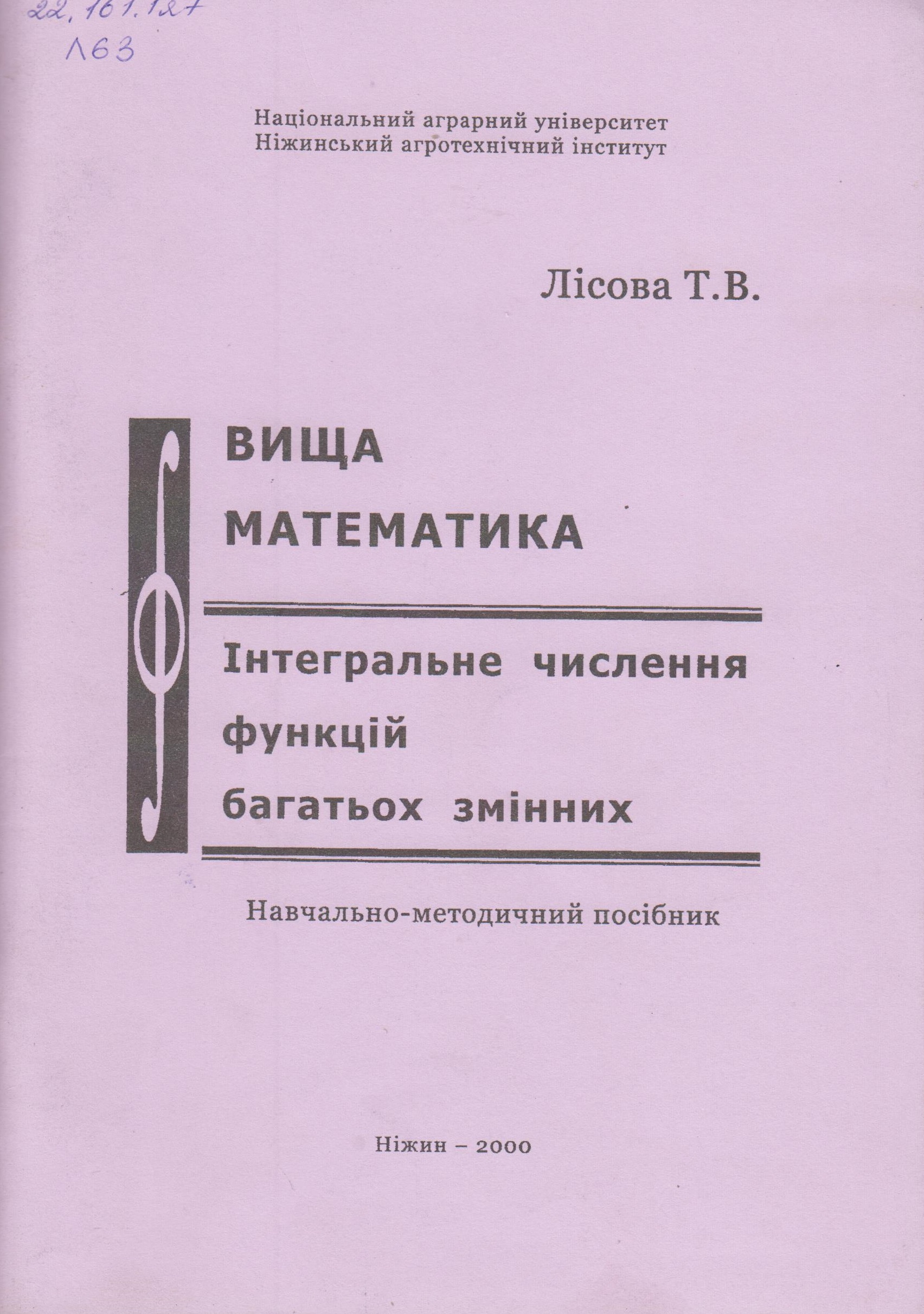 Лісова Т. В. Вища математика. Інтегральне числення функцій багатьох змінних: навчально-методичний посібник / Т.В. Лісова. - Ніжин : НДПУ, 2000. - 75 с.