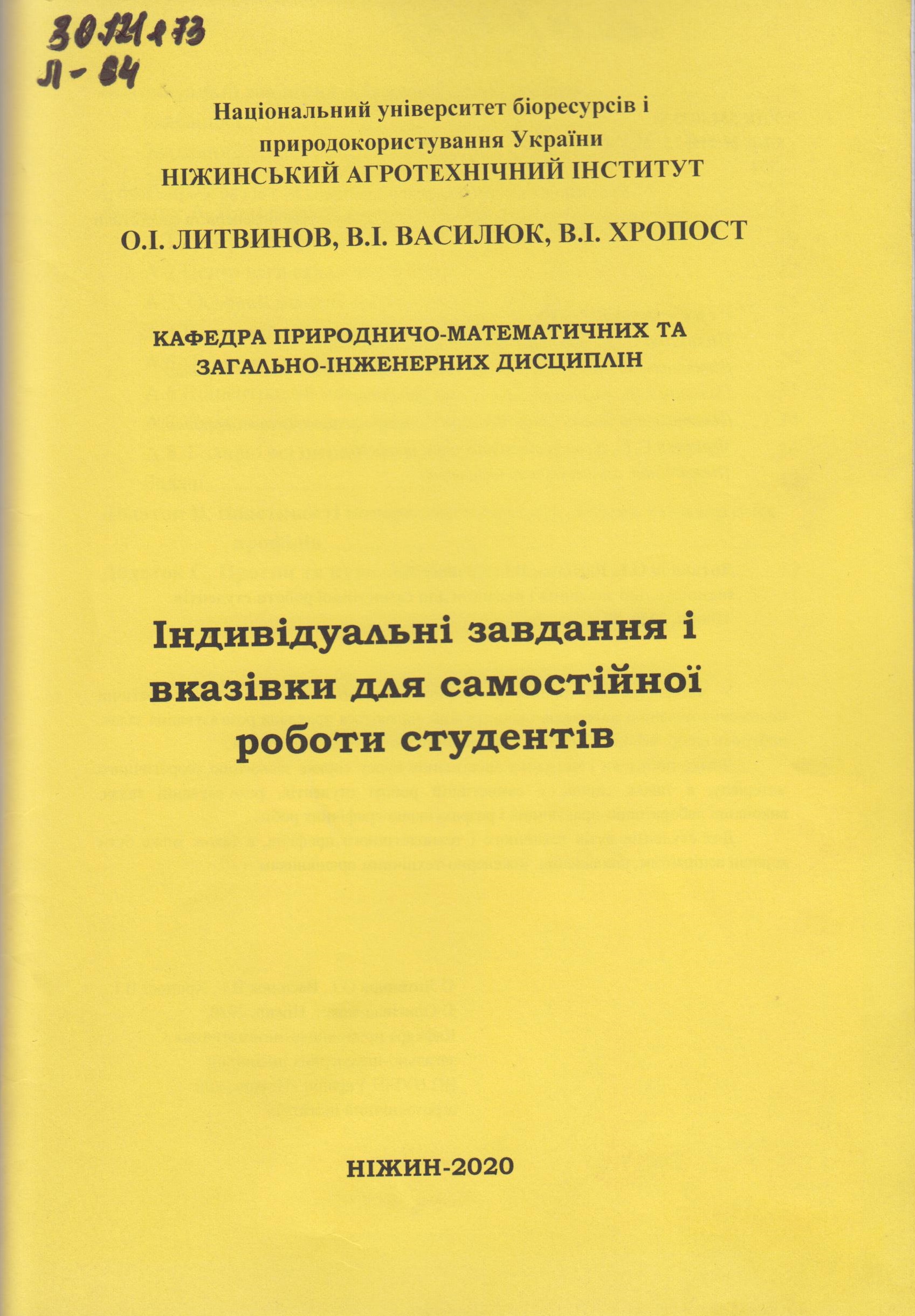 620.17(075.4) Литвинов О.І. Індивідуальні завдання і вказівки для самостійної роботи студентів : завдання і вказівки / О.Ш. Литвинов, В.І. Василюк, В.І. Хропост. - Ніжин : НАТІ, 2020. - 57 с.