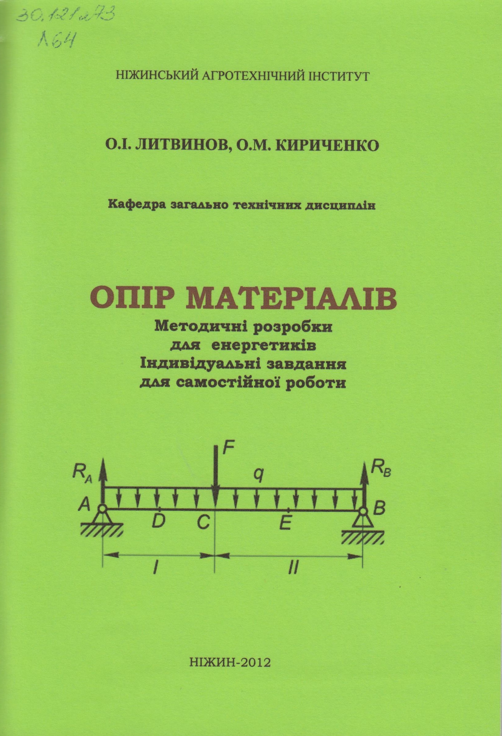620.17(075.4) Литвинов О.І. Опір матеріалів [Текст] : методичні розробки для енергетиків. Індивідуальні завдання для самостійної роботи / О.І. Литвинов, О.М. Кириченко. - Ніжин : НДУ ім. М. Гоголя, 2012. - 96 с.