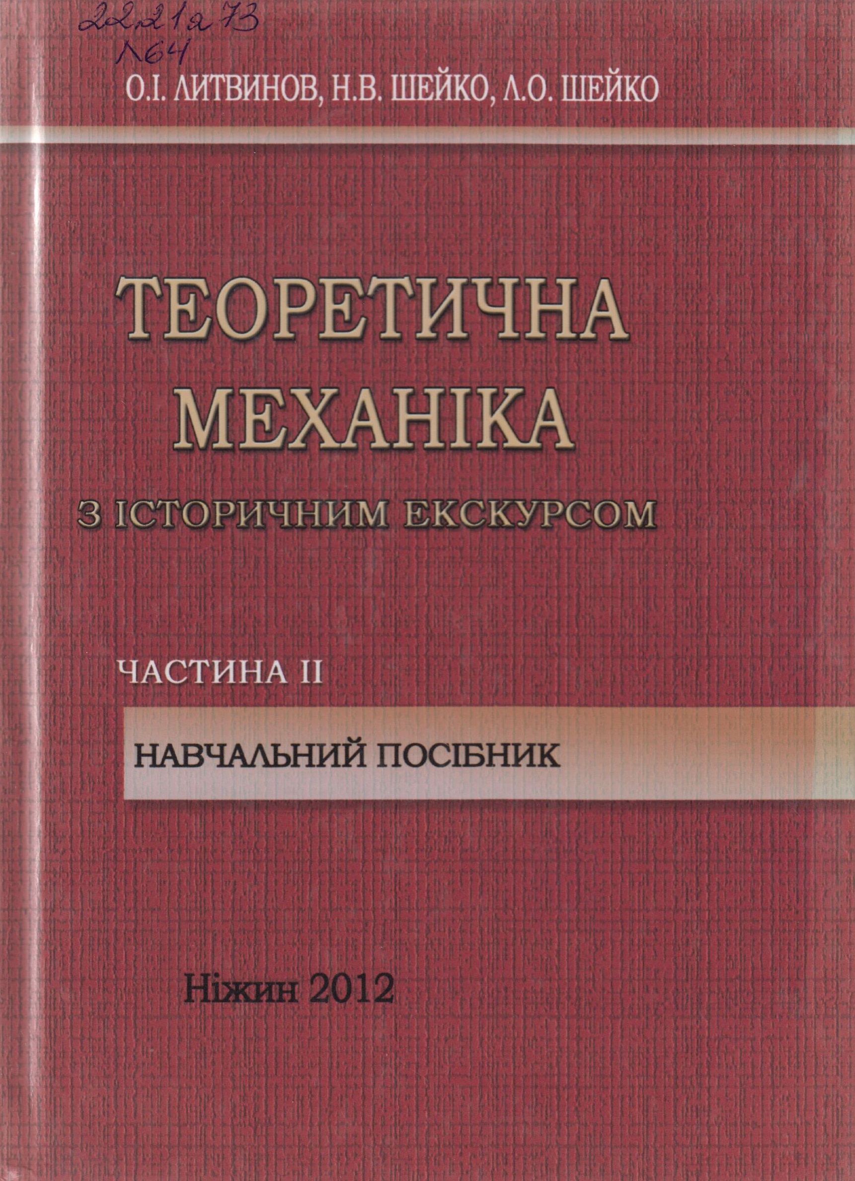 531(075.8) Литвинов О.І. Теоретична механіка з історичним екскурсом : навчальний посібник у 2-х ч. Ч. ІІ / О. І. Литвинов, Н. В. Шейко, Л. О. Шейко. - Ніжин : НДУ ім. М. Гоголя, 2012. - 440 с.