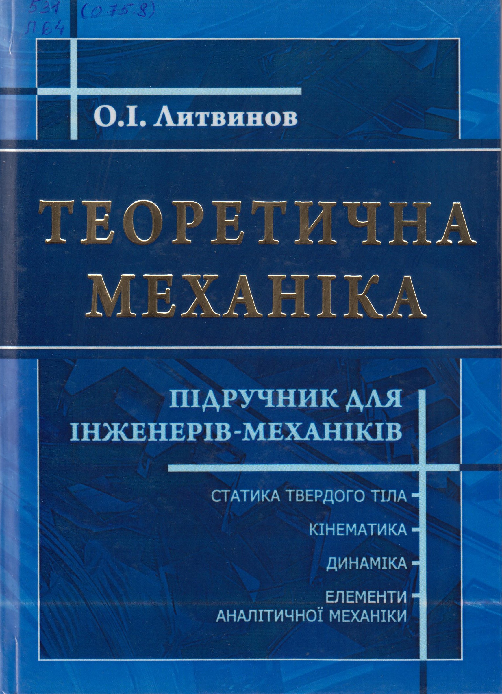531(075.8) Литвинов О.І., Теоретична механіка. Підручник для інженерів-механіків. Ніжин : ПП Лисенко М.М. 2016. - 543 с.