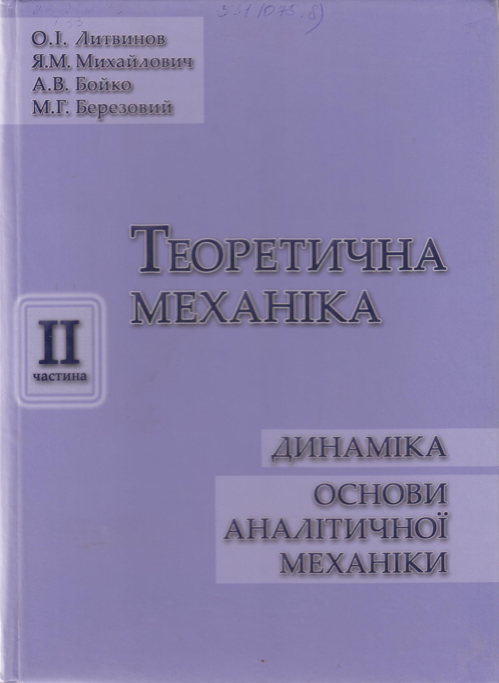 531(075.8) Теоретична механіка : підручник у 2-х ч. Ч. ІІ. Динаміка. Основи аналітичної механіки / О. І. Литвинов, Я. М. Михайлович, А. В. Бойко, М. Г. Березовий. - Київ : Агроосвіта, 2013. - 576 с. - ISBN 978-966-2007-30-5