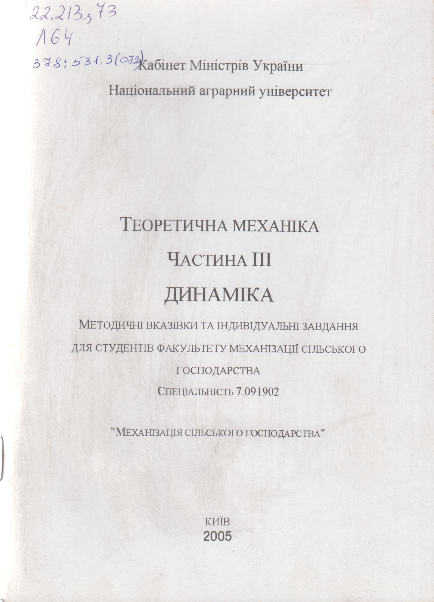 531(072) Литвинов О.І. Теоретична механіка: Ч.ІІІ Динаміка : методичні вказівки та індивідуальні завдання для студентів факультету механізації сільського господарства / О. І. Литвинов. - Київ : НАУ, 2005. - 106 с.