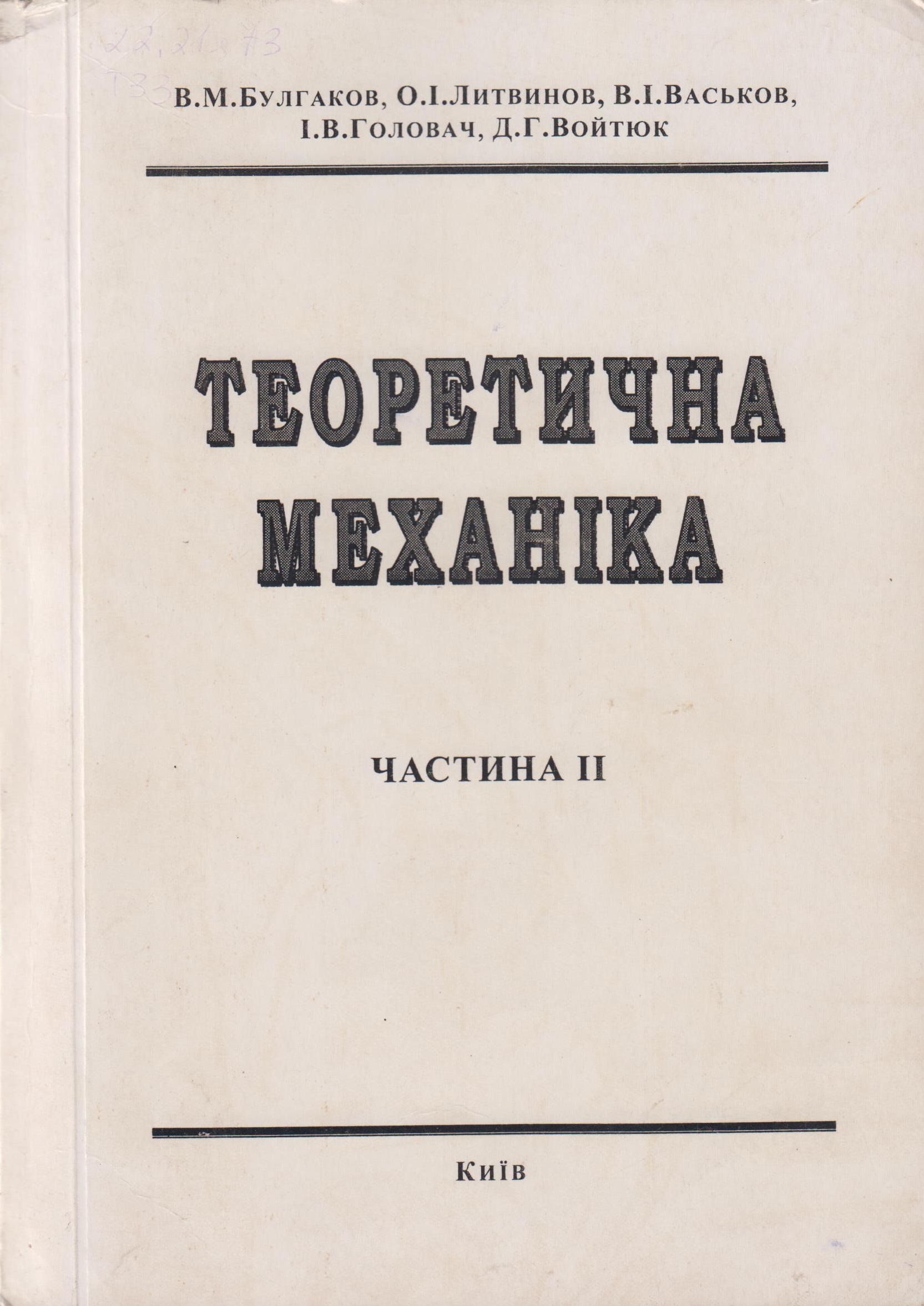 531(075.8) Теоретична механіка : курс лекцій. Ч. ІІ / В. М. Булгаков, О. І. Литвинов, В. І. Васьков, І.В. Головач, Д.Г. Войтюк. - Київ : НАУ, 2004. - 342 с. - ISBN 966-7906-ХІІ