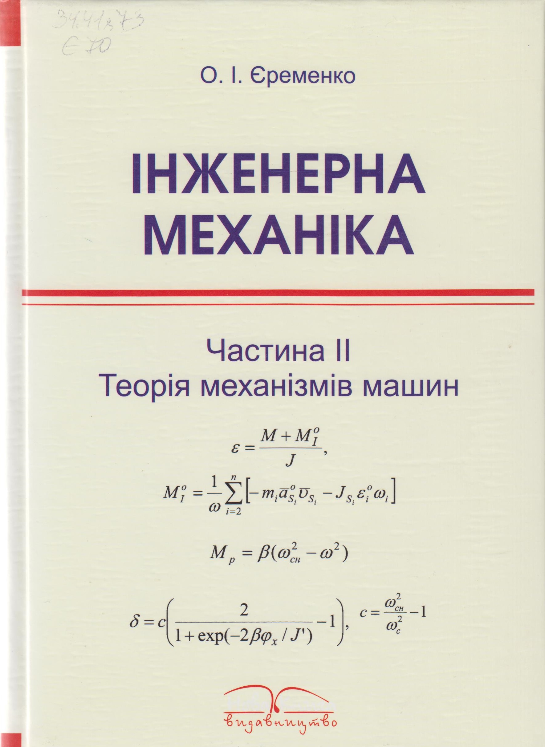 621.01(075.8) Єременко О.І. Інженерна механіка : підручник. Ч.2. Теорія механізмів і машин / О.І. Єременко. - Вінниця : Нова книга, 2009. - 368 с. - ISBN 978-966-382-217-4